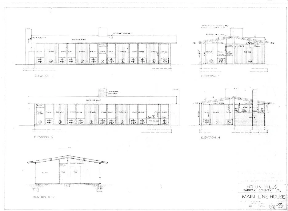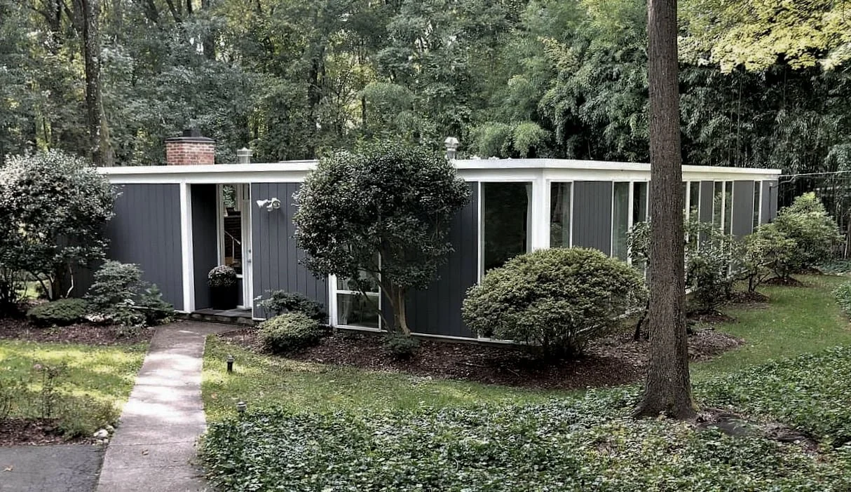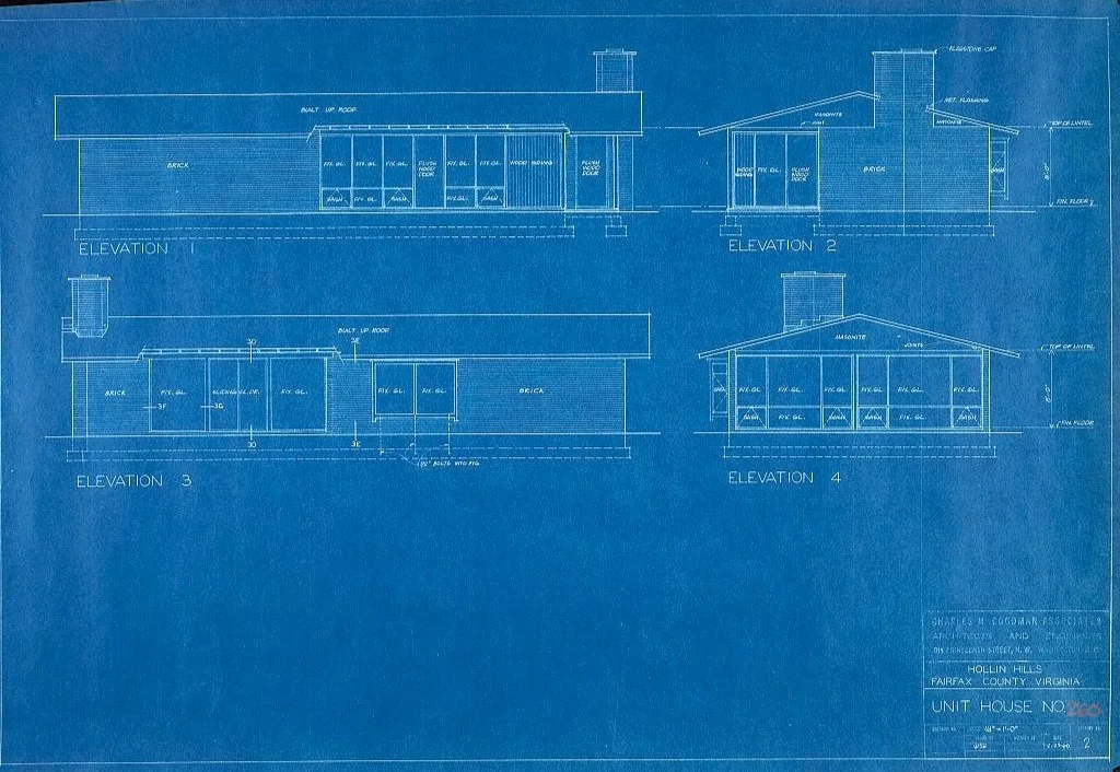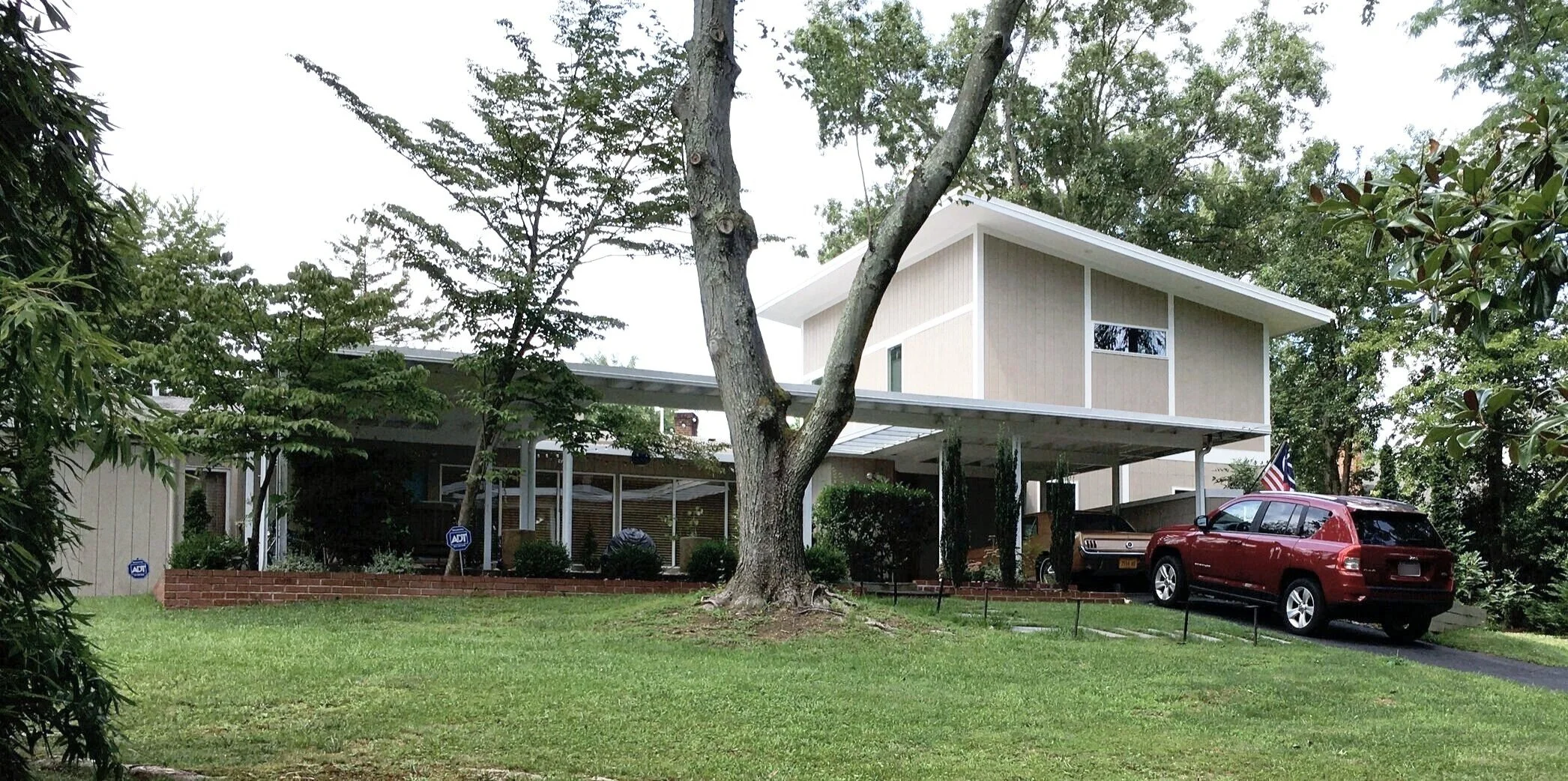The first one built can be seen at 7300 Rippon Road, and many of the Type 1 houses and their variations were built near the intersection of Rippon Road and Drury Lane, the first part of Hollin Hills to be developed.