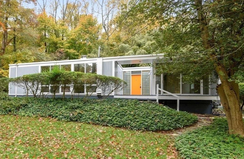 The houses featured a futuristic GE “work-saver” kitchen, central air conditioning, and synthetic materials that were going to bring about “a new era of Care-free living amid heart-warming beauty.” The developers billed it as a house that could easily be kept clean with a damp cloth. The house — with its purple exterior walls and greenish-gold front door, is notable for its exuberant use of color, as well.