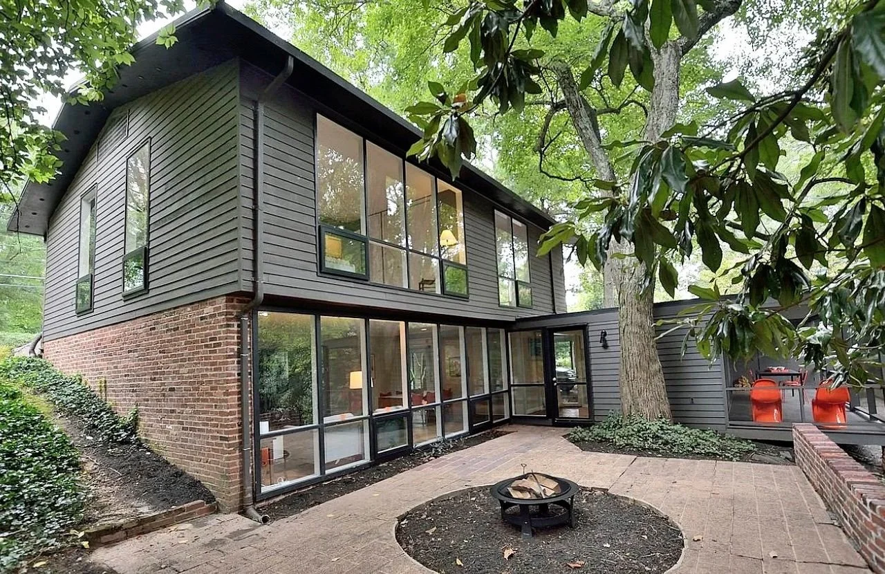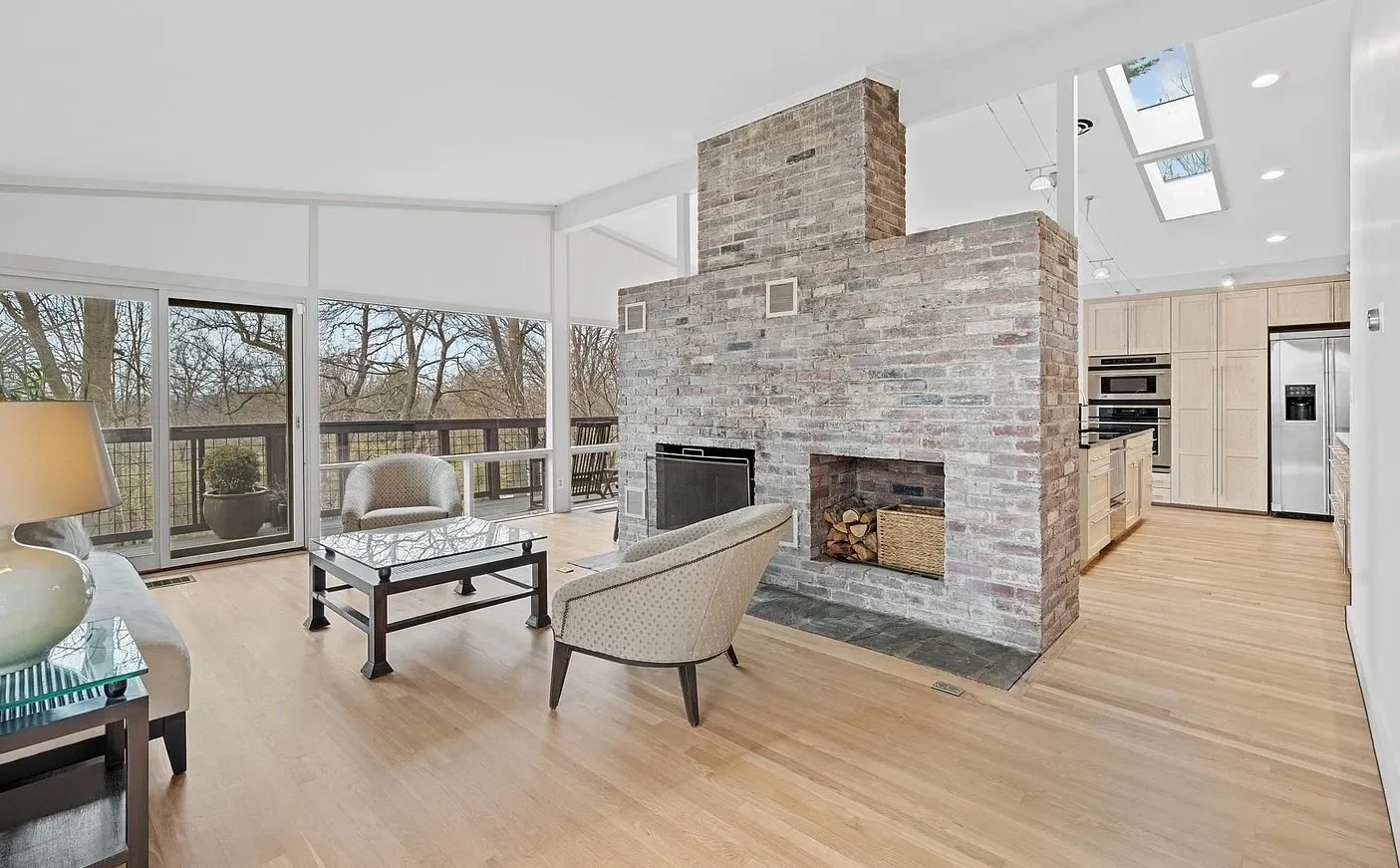 Another short flight of stairs leads up to the kitchen and an open, 27-foot living and dining area on the top level. The upper level is marked by an 18-foot wall of floor-to-ceiling windows and a wide interior chimney and fireplace of reclaimed brick. While the ground floor is typically made of concrete block (sometimes faced with brick), the upper level is wood-frame construction.