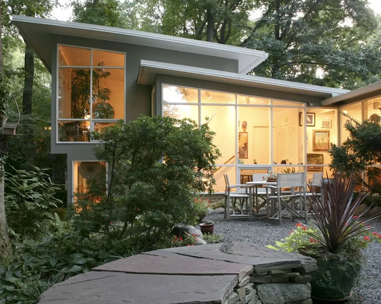 The wood-frame dwelling is faced with T-111 siding, has wide overhanging eaves and an exterior-end chimney, and features floor-to-ceiling window walls measuring up to 28 feet wide.