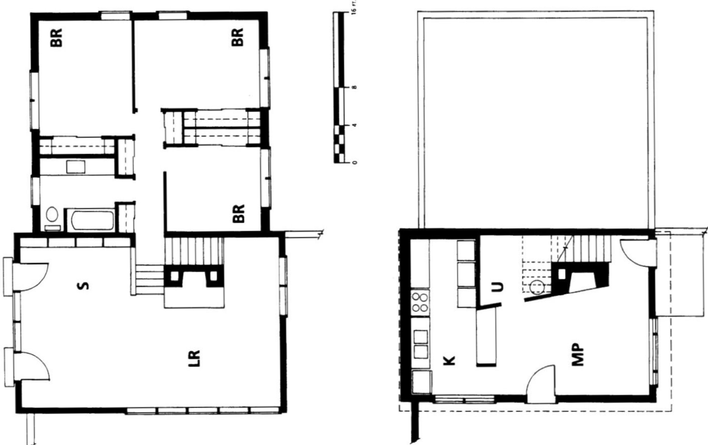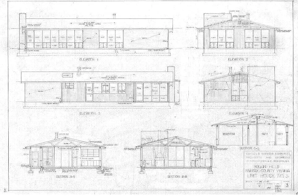 A key advantage of this flexible system was that it allowed Goodman to adapt the plans to differing sites. For the hillsides of Drury Lane, for instance, he developed the very popular Type 2B42LB, a longer, two-level house with extra bedrooms in the lower level, which was priced at $18,150 (without the lot).
