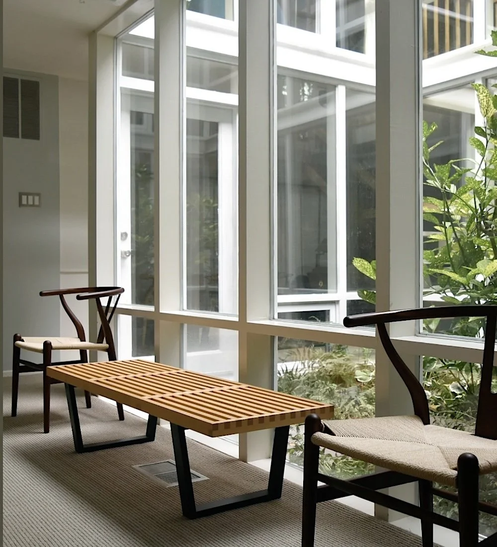 The Type 10 is notable for its large windows; the exterior bays are 12 feet wide and are filled with two sheets of fixed glass, each nearly 6 feet wide, while fixed glass almost 7 feet wide is used on the elongated window modules of the living/dining area.