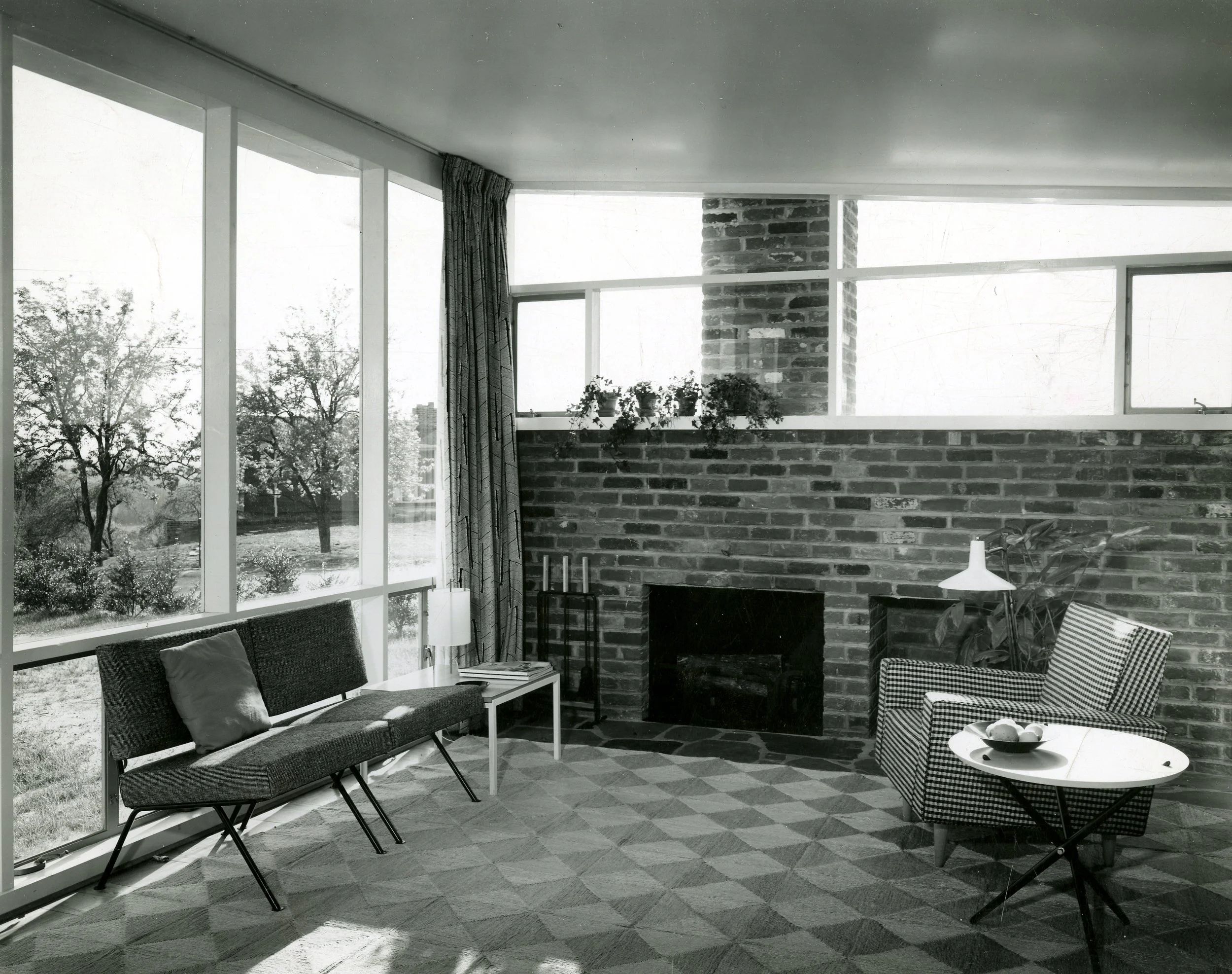 The brick chimney is the same freestanding sculptural chimney stack developed by Goodman in the Type 2 “butterfly” design, and the concrete-block chimney wall on the interior of the earlier variations was sometimes replaced with a “wood-surface wall” or brick wall.