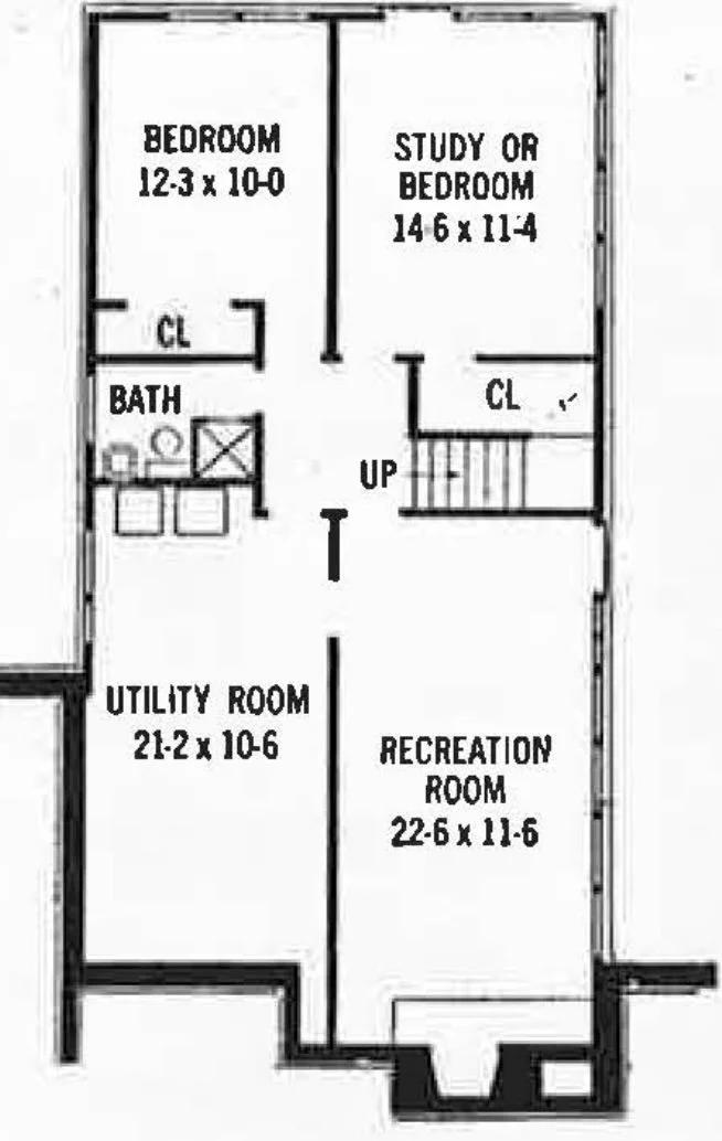 The house can be accessed from both levels, and while the upper level is similar to the basic Type 2 layout, the lower has an additional two bedrooms and a bath, a recreation room with fireplace, and a utility area.